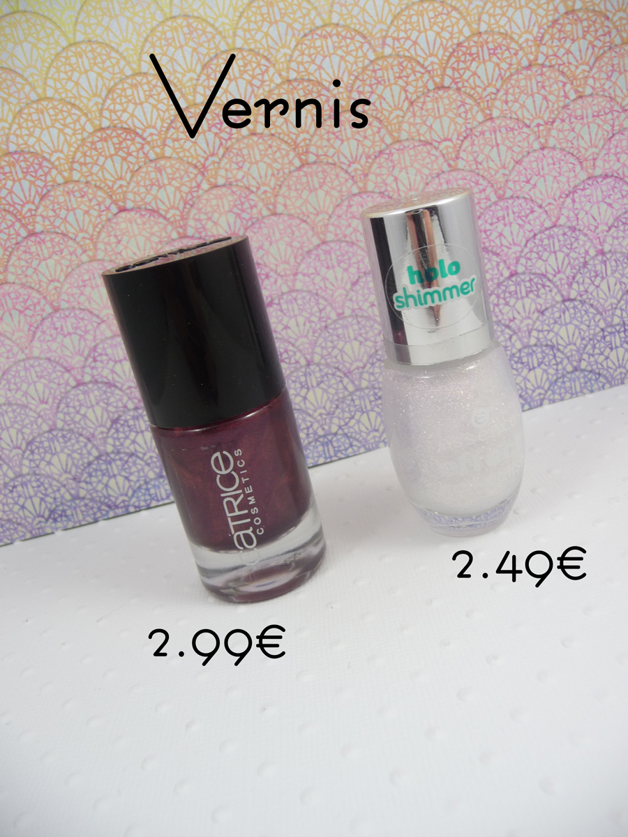 Au niveau du vernis, j’ai pris chez Essence un vernis à effet Nail Polish en teinte 01 Pixie Dust. Chez Catrice, j’ai pris un Ultimate Nail Lacquer en teinte 59 First Class Up-Grape